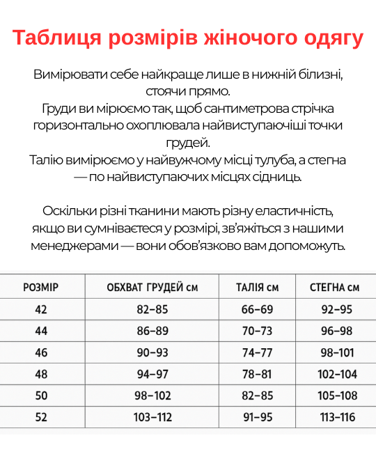 - Розміри: 42(XS),44(S),46(M),48(L),50(ХL),52(2ХL).